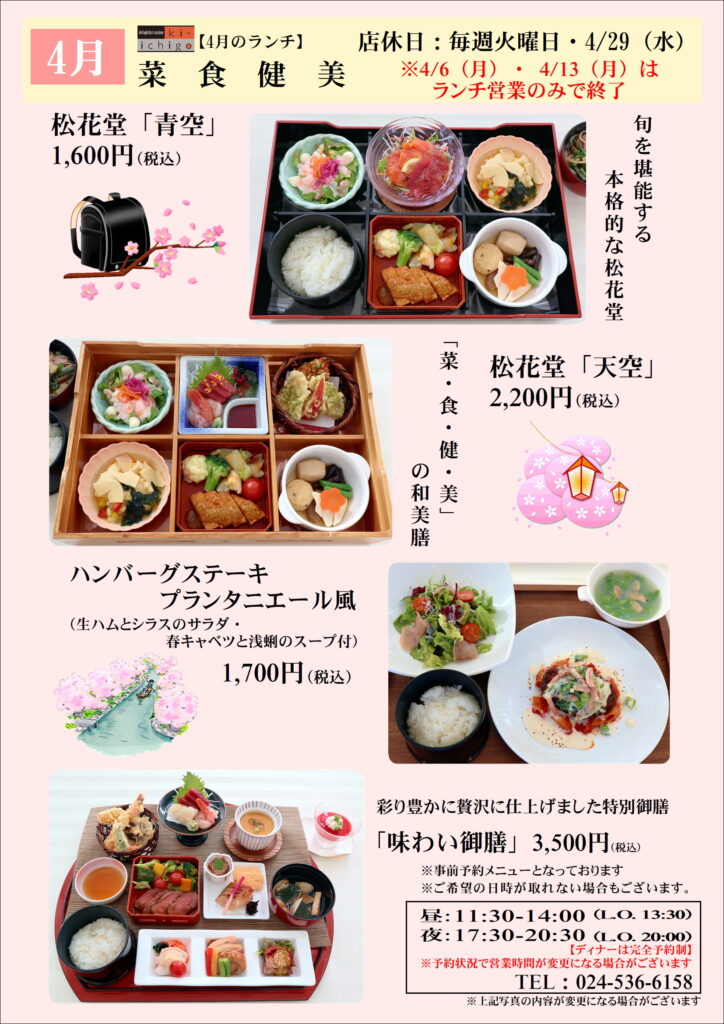※4月6日(月)、13日(月)はランチ営業のみで終了 11:30~14:00(L.O. 13:30)