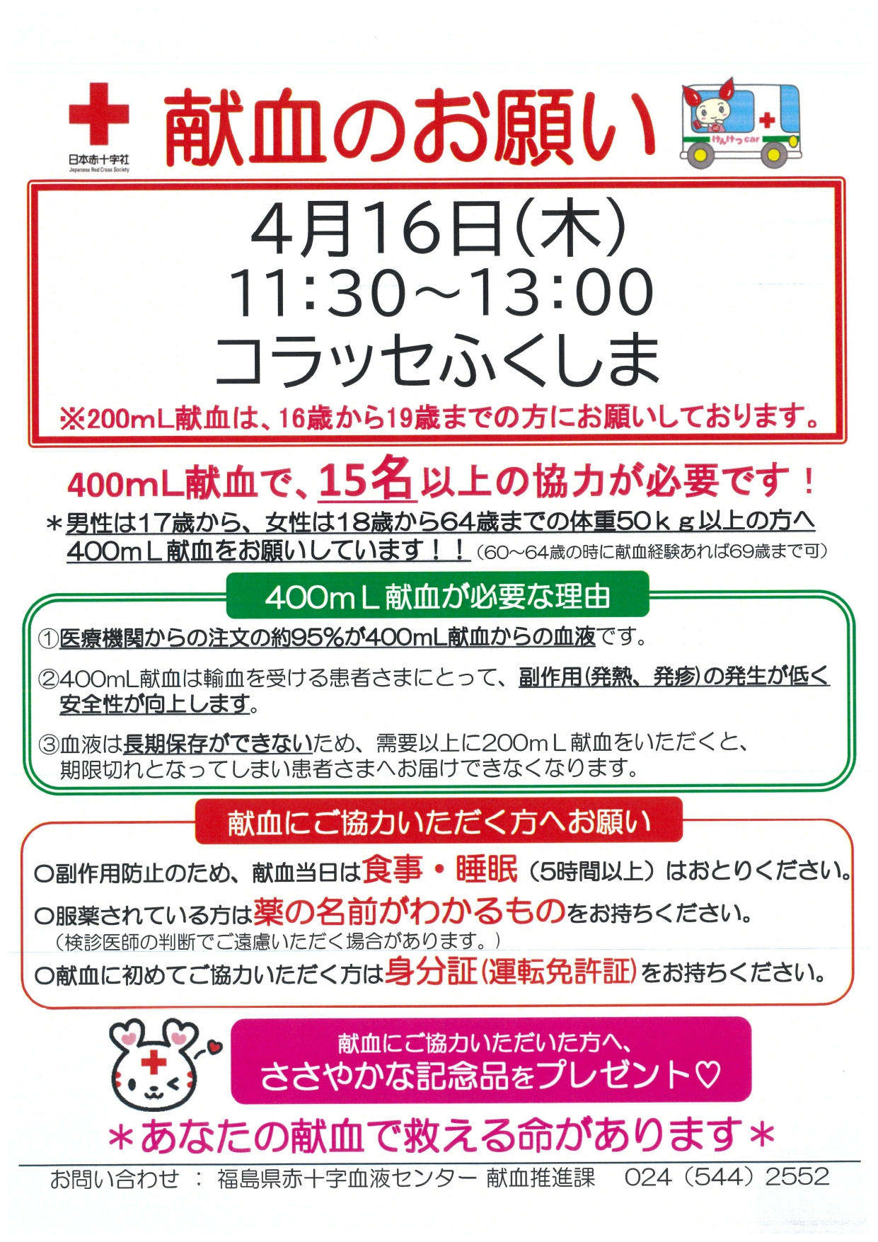 4月16日(木)コラッセふくしまに 献血バスが参ります! みなさんのご協力をお待ちしております。